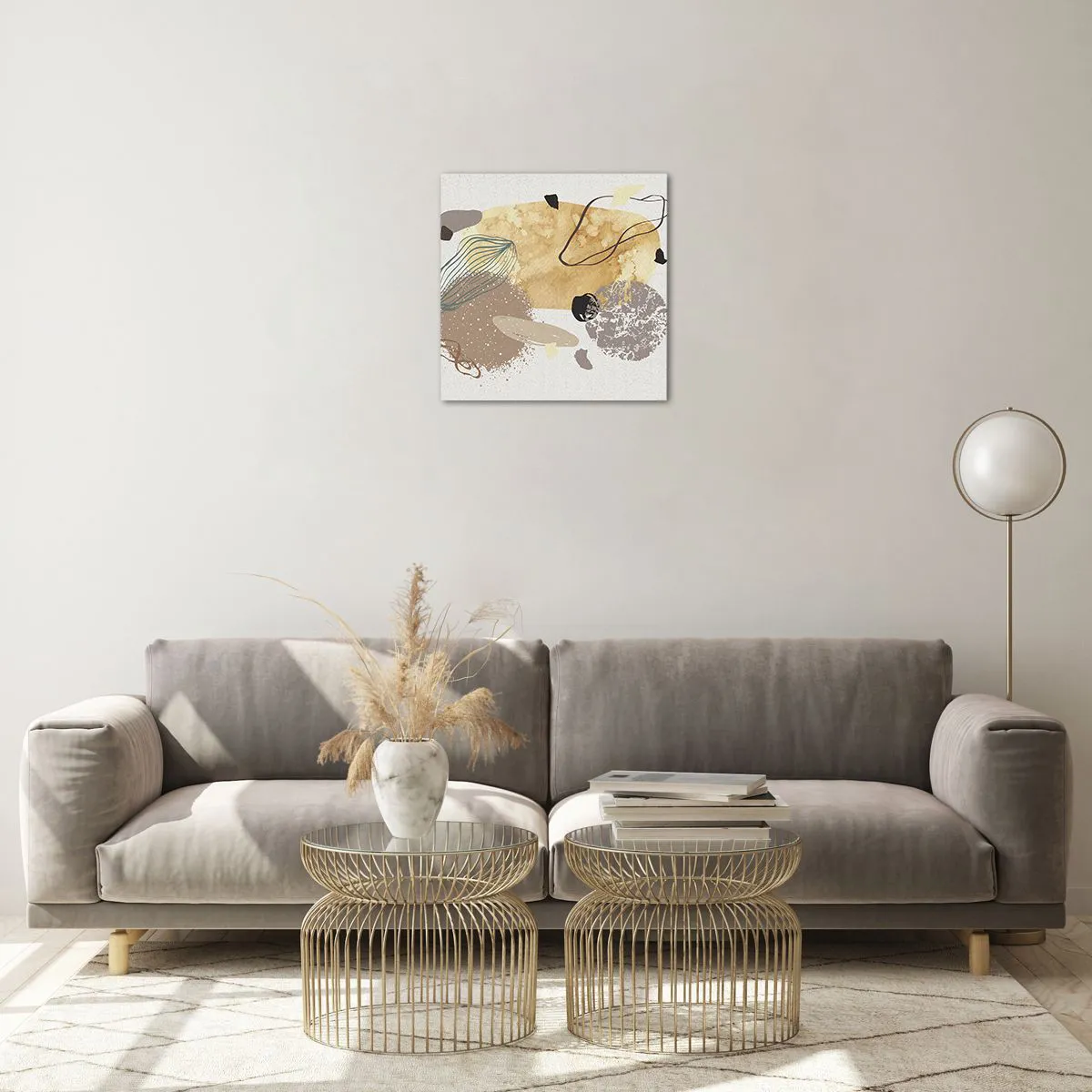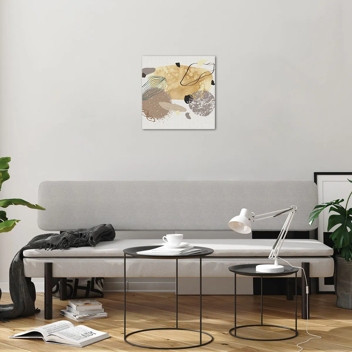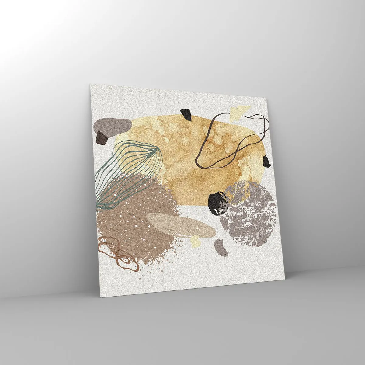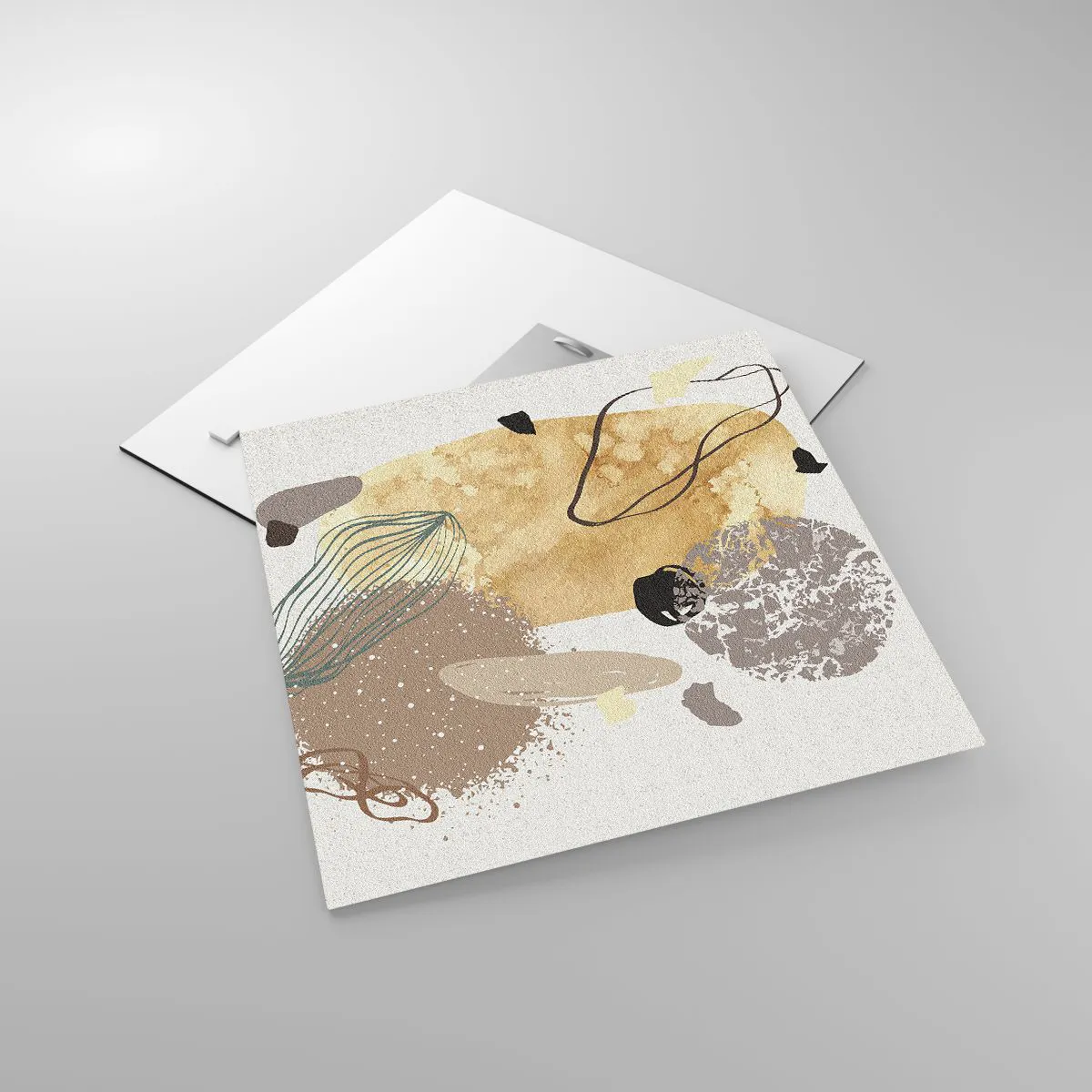 O quadro em vidro é feito de vidro de 4mm de espessura. As bordas do vidro têm um corte trapezoidal fosco. O quadro é segura de usar e pronto para pendurar – tem ganchos de metal presos à parte de trás do quadro e e espaçadores de espuma para regular a distância uniforme do quadro da parede.