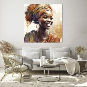 Quadro em vidro - Retrato em aquarela de uma mulher sorridente com turbante - 70x50cm - Rainha africana - Decoração de parede moderna para a sala de estar e quarto ARTTOR
