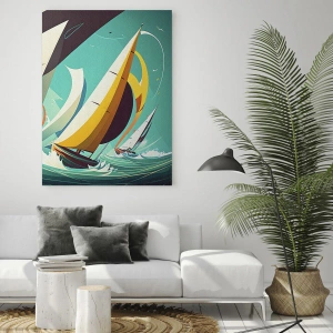 - Uma ilustração colorida retratando veleiros lutando contra as ondas em estilo retrô. Uma pintura repleta de dinâmica e expressão marítima — perfeita para interiores modernos e náuticos.