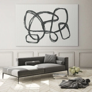 Quadro em vidro - Laços e linhas pretas formam uma composição abstrata sobre um fundo branco. - 70x50cm - Abstração em loop - Decoração de parede moderna para a sala de estar e quarto ARTTOR