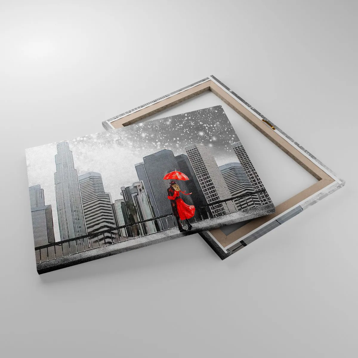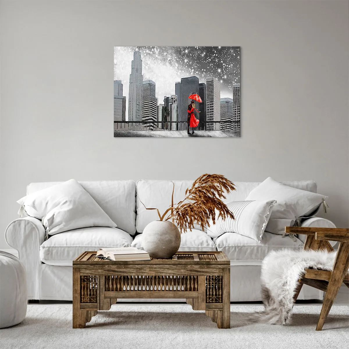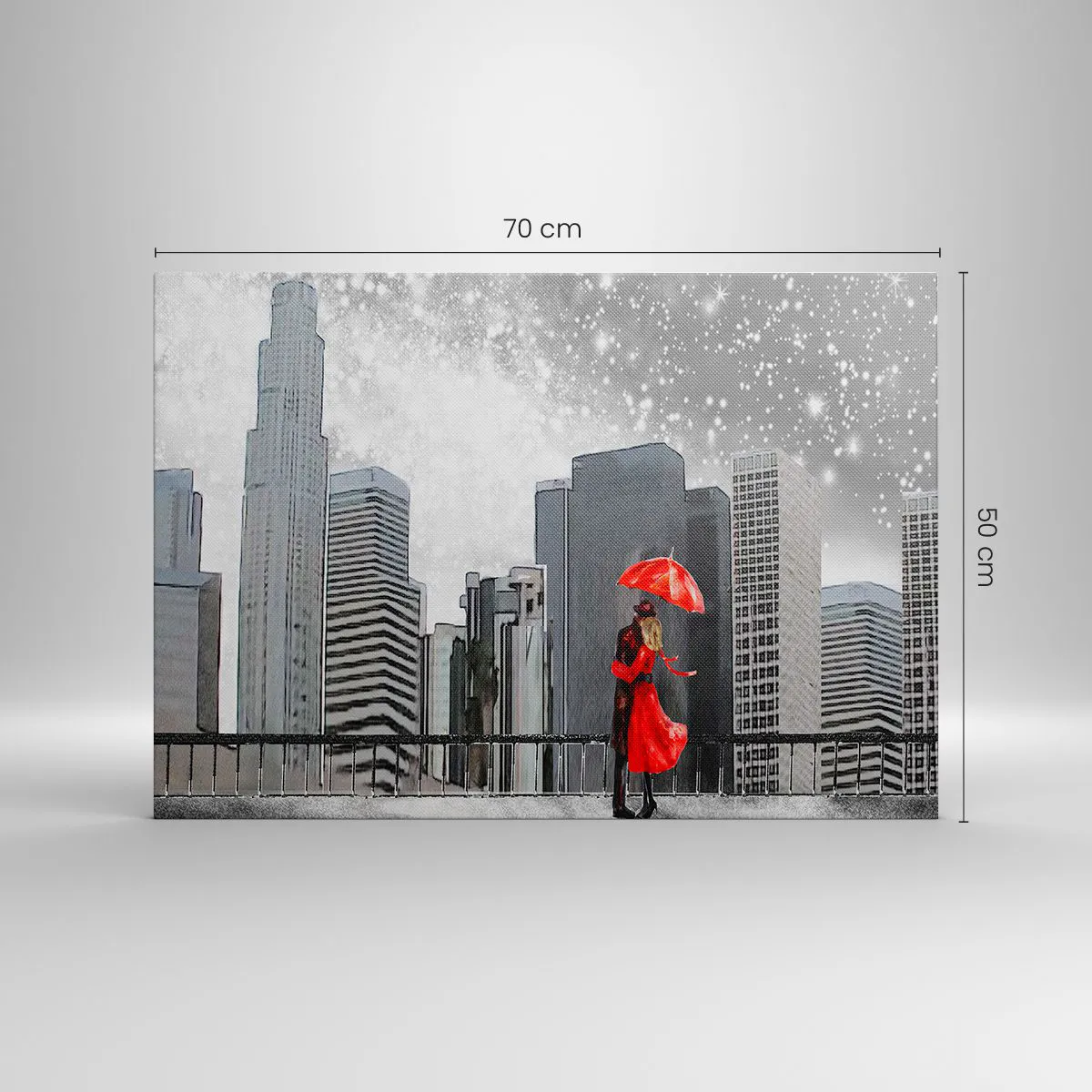 Quadro em tela - Um casal de vermelho com um guarda-chuva no contexto de uma paisagem urbana - 70x50cm - O homem não é pedra - Decoração de parede moderna para a sala de estar e quarto ARTTOR
