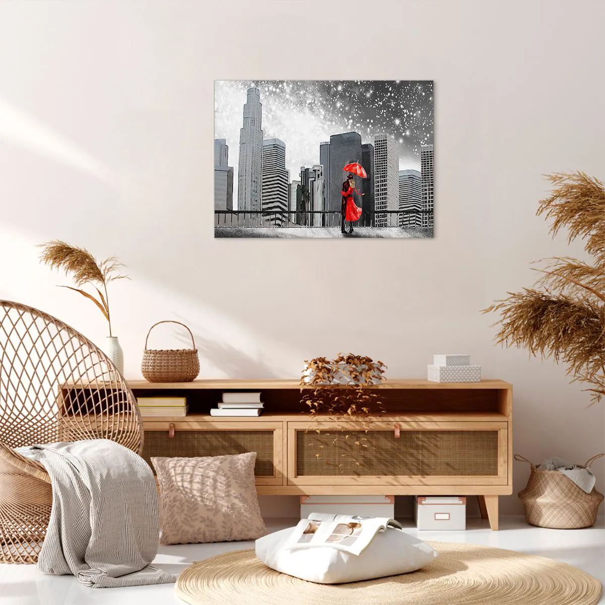 Arte de parede - Homem, Não uma Pedra - Um casal de vermelho com um guarda-chuva contra o pano de fundo de uma paisagem urbana