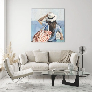 O uso de uma técnica que lembra a pintura acrílica, com pinceladas visíveis, confere expressão e autenticidade à obra. Os tons dominantes de azul, branco e bege criam uma atmosfera fresca e leve. O motivo de férias e a silhueta feminina em estilo náutico tornam a pintura perfeita para interiores inspirados em praia, viagens e tranquilidade.