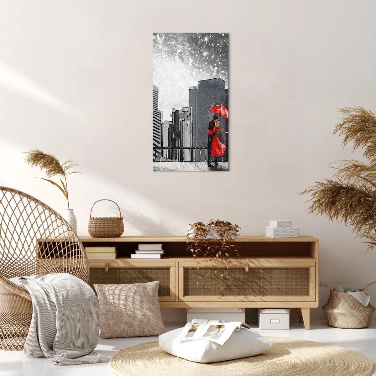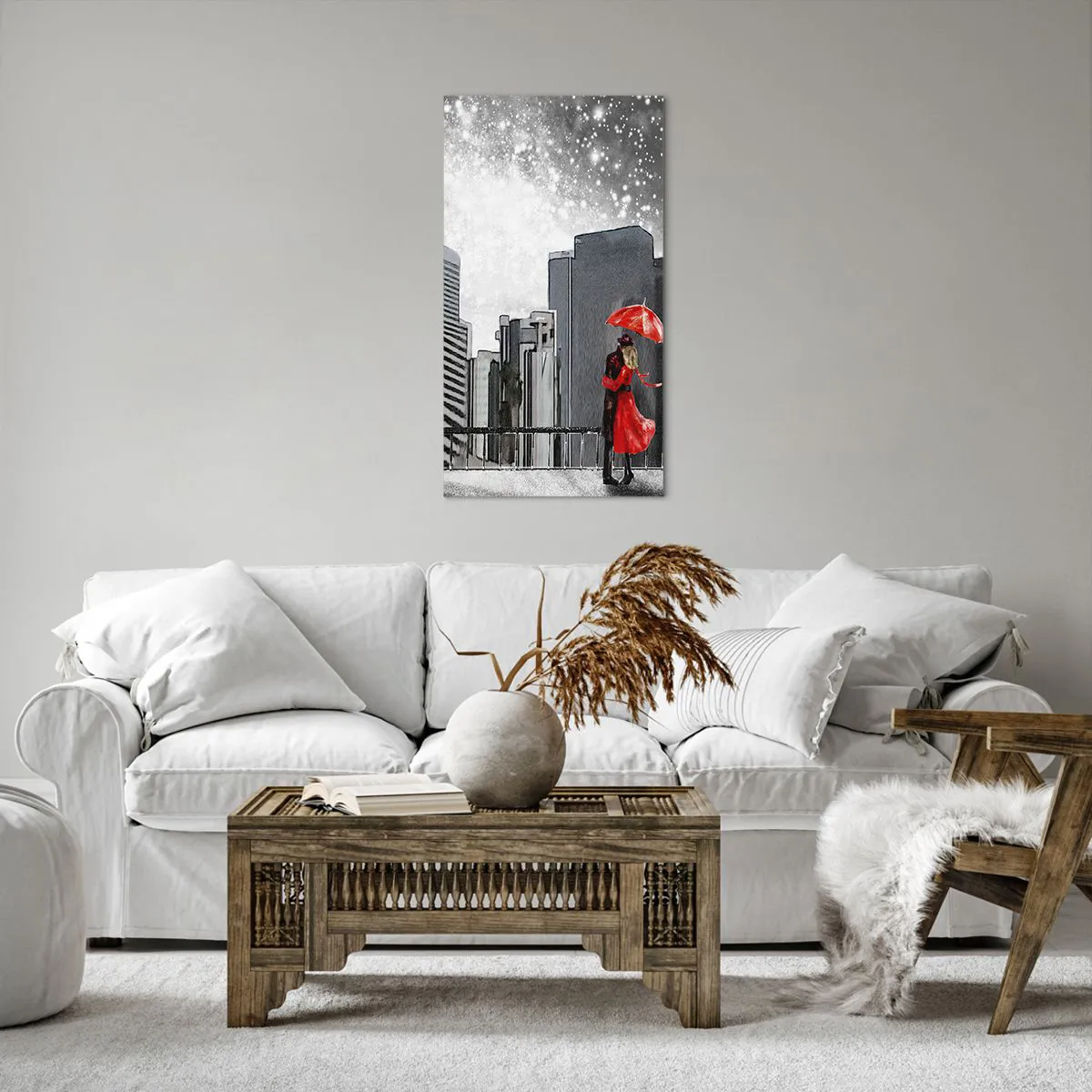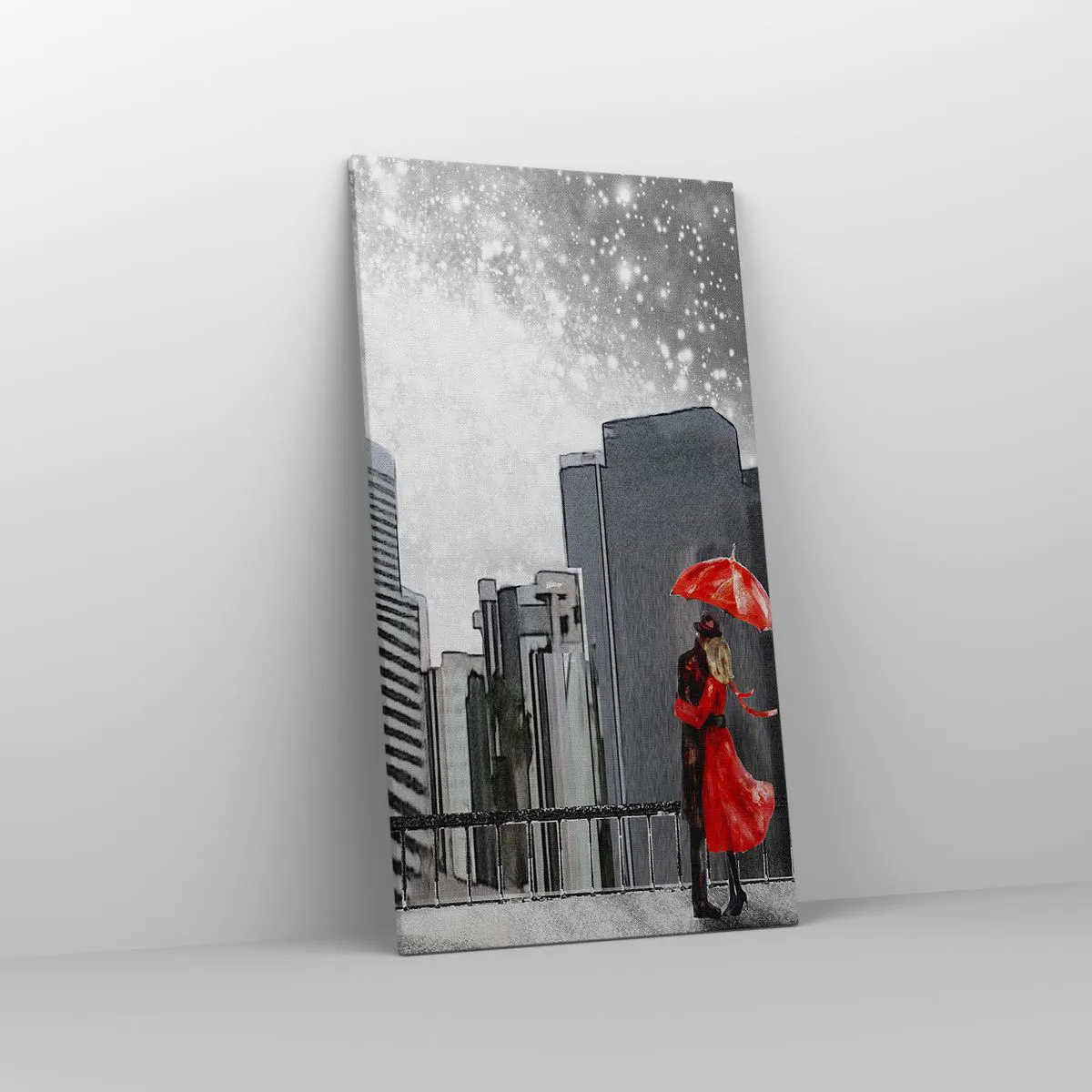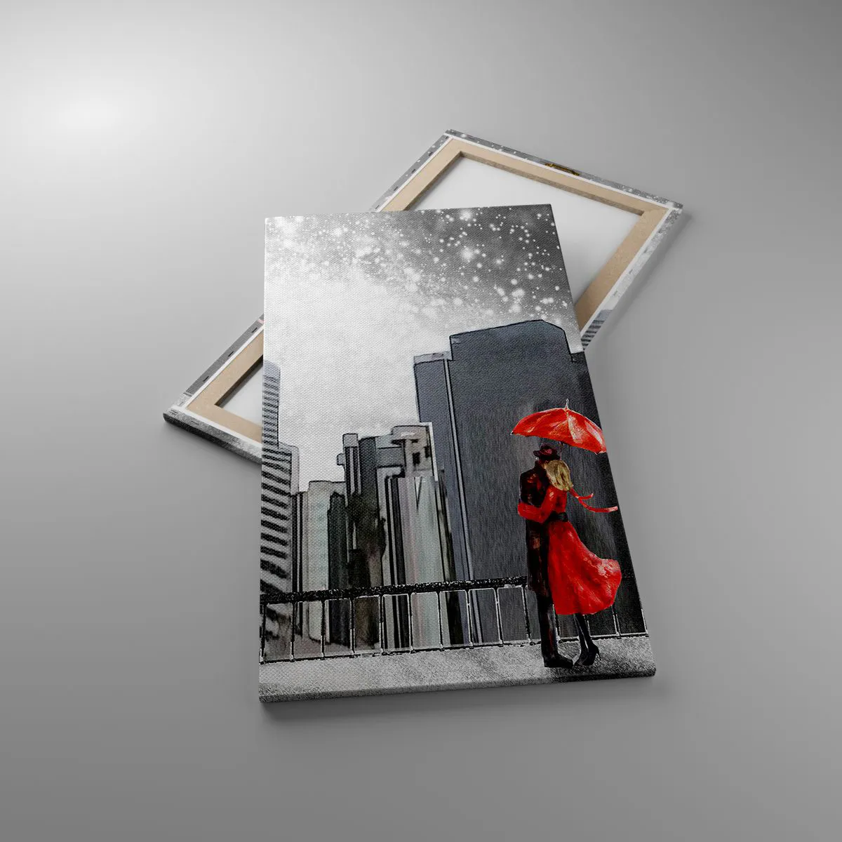 A tela é esticada na moldura. Os lados e bordas são impressos para criar uma continuação da imagem. O quadro está pronto para ser pendurado na parede. Cada produto tem um gancho ligado à moldura e um conjunto de montagem (parafuso + cavilha).