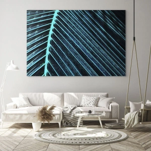 - A pintura retrata um close-up macro de uma folha de palmeira em tons turquesa. Sua estrutura intensa e caráter moderno são ideais para interiores inspirados na natureza.