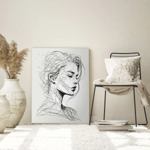 Quadro de Parede - Retrato em Pensamento - Esboço em Preto e Branco de uma Mulher com Olhos Fechados em uma Linha Delicada