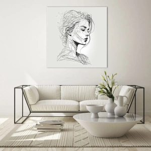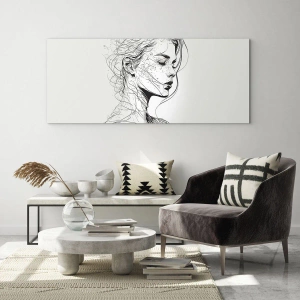 Quadro em vidro - Um esboço em preto e branco de uma mulher com os olhos fechados em uma linha delicada. - 70x50cm - Retrato em pensamento - Decoração de parede moderna para a sala de estar e quarto ARTTOR