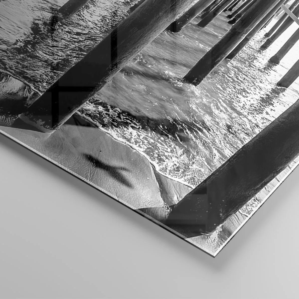 O quadro em vidro é feito de vidro de 4mm de espessura. As bordas do vidro têm um corte trapezoidal fosco. O quadro é segura de usar e pronto para pendurar – tem ganchos de metal presos à parte de trás do quadro e e espaçadores de espuma para regular a distância uniforme do quadro da parede.