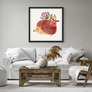 O ouriço, símbolo da natureza florestal, é retratado em tons quentes de marrom, e suas penas são decoradas com detalhes vegetais e uma maçã suculenta. O fundo suave em tons pastel enfatiza o estilo harmonioso e torna o pôster um elemento decorativo universal.