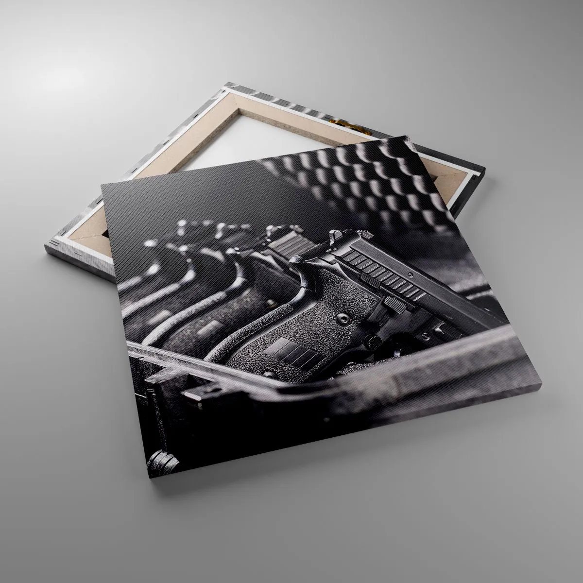 A tela é esticada na moldura. Os lados e bordas são impressos para criar uma continuação da imagem. O quadro está pronto para ser pendurado na parede. Cada produto tem um gancho ligado à moldura e um conjunto de montagem (parafuso + cavilha).