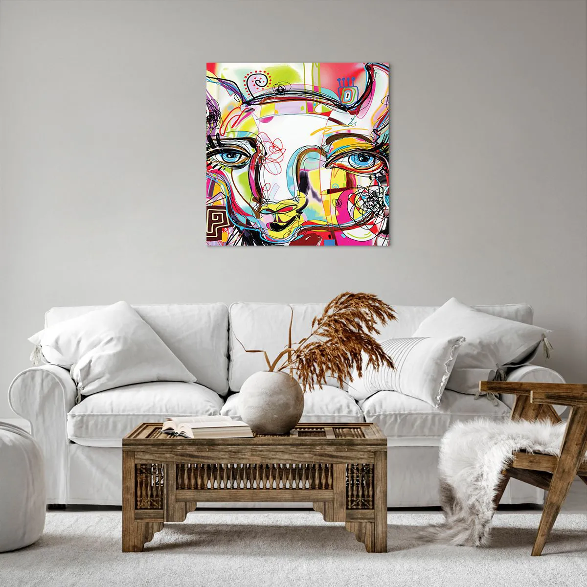 A tela é esticada na moldura. Os lados e bordas são impressos para criar uma continuação da imagem. O quadro está pronto para ser pendurado na parede. Cada produto tem um gancho ligado à moldura e um conjunto de montagem (parafuso + cavilha).