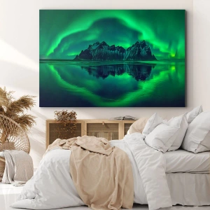 Quadro em tela - Montanhas cercadas pela aurora boreal refletida na água - 70x50cm - Nos braços da aurora - Decoração de parede moderna para a sala de estar e quarto ARTTOR