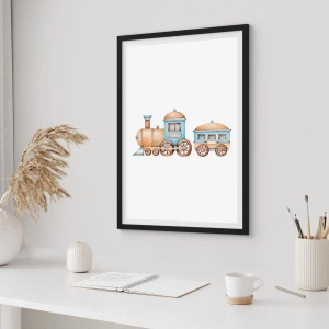 - Este charmoso pôster de trem em aquarela apresenta tons pastéis de azul e bege. A delicada ilustração é perfeita para o quarto de uma criança, conferindo-lhe um toque aconchegante e de conto de fadas.