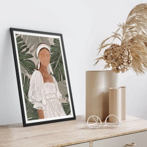 Pôster com moldura preta - Uma mulher de vestido branco sobre um fundo de folhas verdes - 50x70cm - Retrato exótico - Decoração de parede moderna para a sala de estar e quarto ARTTOR