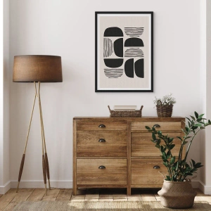 - O pôster apresenta uma abstração geométrica com formas e linhas pretas sobre fundo bege. Sua composição moderna o torna perfeito para interiores contemporâneos. É de alta qualidade e vem emoldurado em uma moldura preta.