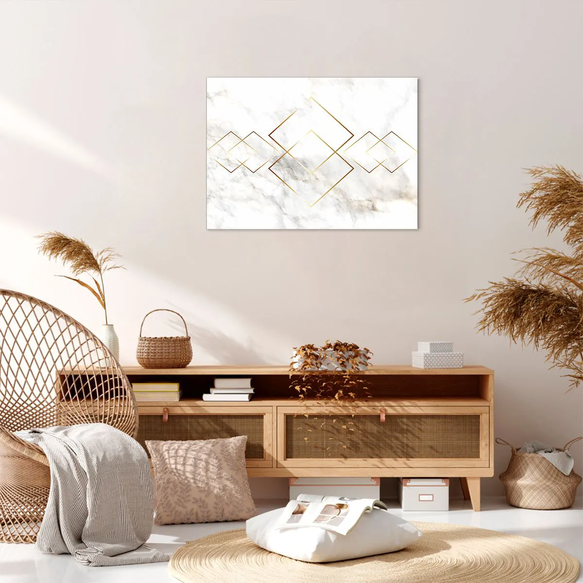 - Uma impressão em tela com losangos dourados minimalistas sobre um fundo branco que lembra mármore. Um elegante acessório decorativo em estilo moderno que traz luxo e harmonia a qualquer ambiente.