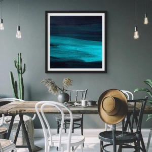 O contraste entre os tons escuros e o turquesa iluminado torna o pôster atraente e exala elegância. É uma excelente escolha para quem valoriza decorações minimalistas que adicionam personalidade e expressão artística a um interior. Ficará ótimo em uma sala de estar, escritório ou quarto, introduzindo uma atmosfera de paz e estética moderna.