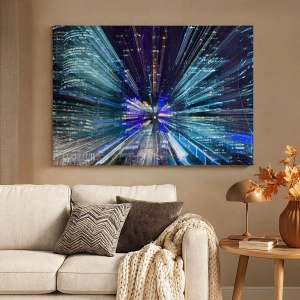 - Esta impressão em tela retrata uma paisagem urbana noturna dinâmica com efeito de iluminação. Uma decoração moderna que traz energia e estilo futurista a qualquer interior.