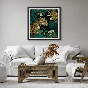 O leopardo simboliza força, coragem e independência há séculos. Seu olhar atento e suas manchas perfeitamente reproduzidas contra a densa vegetação fazem com que o pôster capture perfeitamente a beleza selvagem da natureza. Cores profundas e saturadas e o contraste entre o fundo escuro e os detalhes dourados conferem profundidade à imagem e uma atmosfera única.