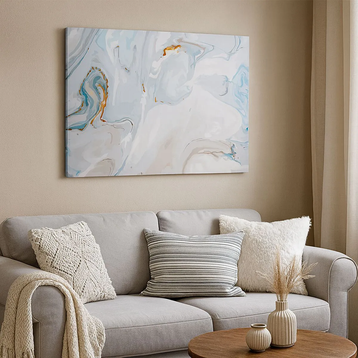 - A pintura retrata ondas abstratas em tons sutis de branco e azul. Suas formas orgânicas e estruturas dinâmicas criam um toque decorativo elegante que combina tanto com salas de estar, quartos quanto com escritórios.