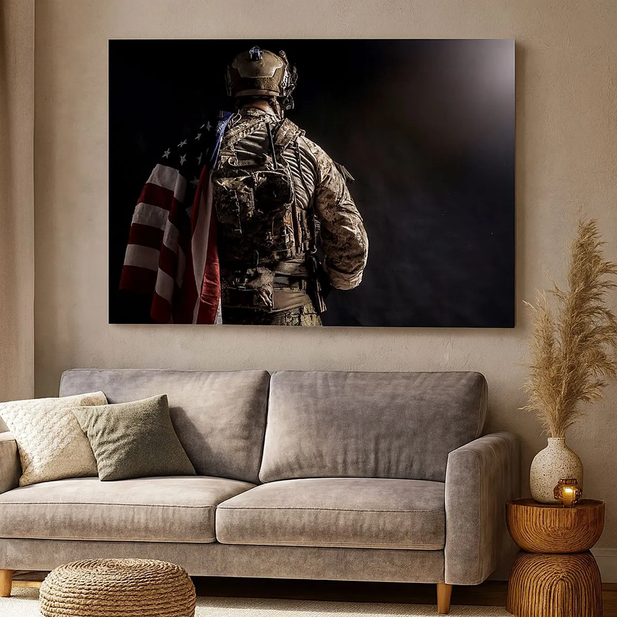 - A pintura retrata um soldado uniformizado com uma bandeira sobre um fundo escuro, enfatizando o simbolismo do patriotismo e da força. É uma decoração ideal para interiores modernos.