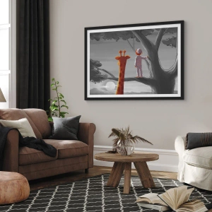 Pôster com moldura preta - Um menino de pijama e uma girafa em uma árvore em uma paisagem cinza e laranja. - 50x70cm - Isso está realmente acontecendo - Decoração de parede moderna para a sala de estar e quarto ARTTOR