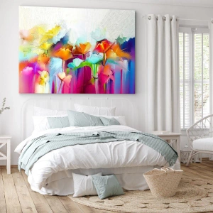 Arte em tela "O Arco-Íris Desabrochou" é uma combinação única de arte moderna e beleza natural. Retrata flores abstratas e coloridas sobre um fundo claro, exalando energia e harmonia, conferindo ao espaço uma sensação distinta e fresca.
