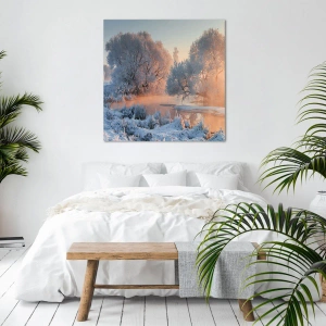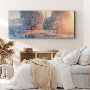 - Uma paisagem mágica de inverno com árvores cobertas de neve banhadas pelos raios do sol poente. O rio reflete delicadamente a luz, criando uma sensação de paz e harmonia. Um complemento perfeito para interiores elegantes.