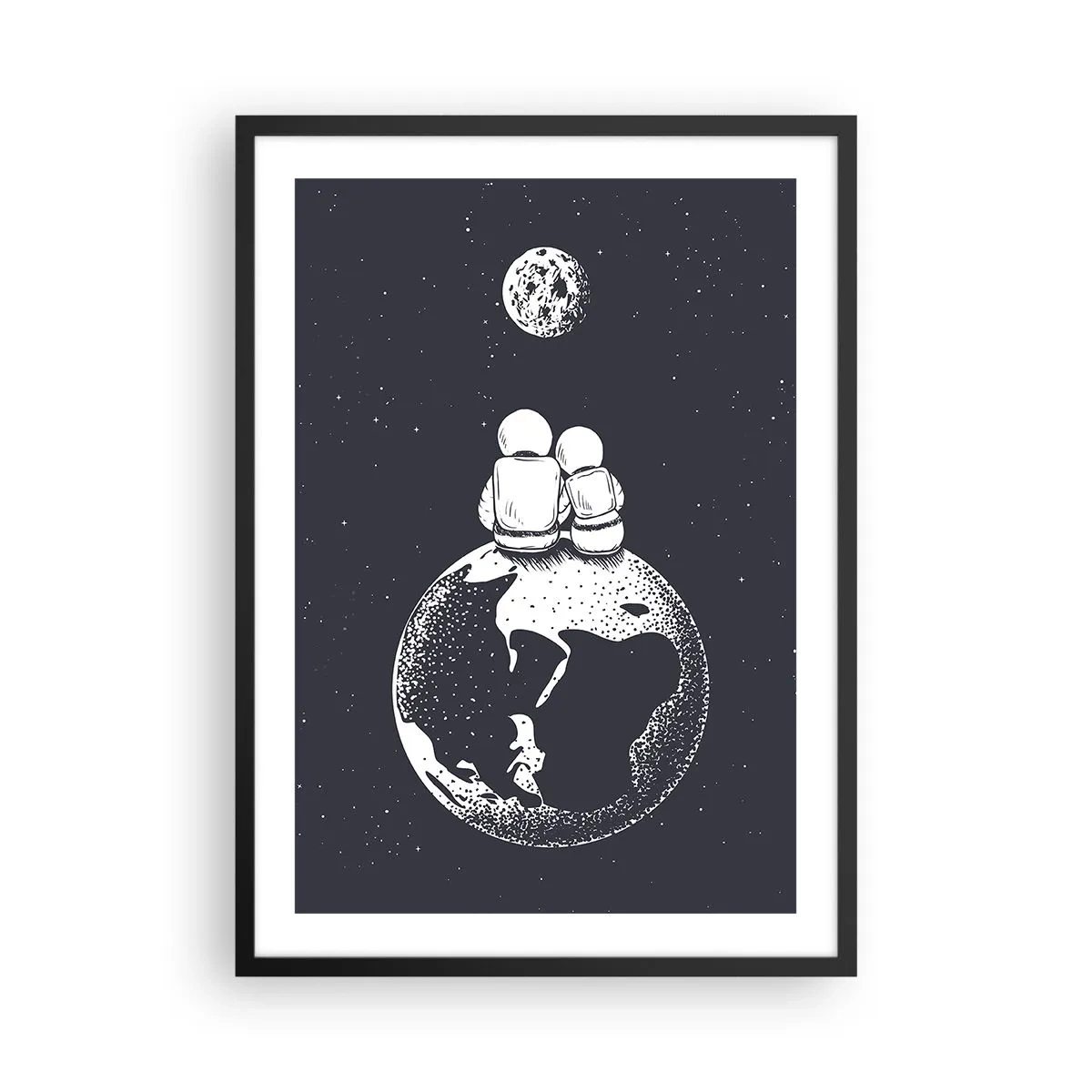 Pôster com moldura preta - Astronautas sentados na Terra olhando para a Lua - 50x70cm - Uma história de amor cósmica - Decoração de parede moderna para a sala de estar e quarto ARTTOR