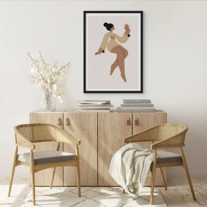 • O pôster retrata a figura estilizada de uma mulher em movimento, apresentada de forma minimalista. A paleta de cores discretas e as linhas simples conferem à composição um caráter moderno e elegante. Inclui moldura preta.