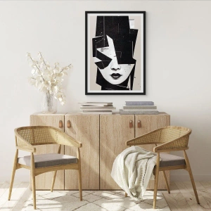 • O pôster apresenta um retrato abstrato de uma mulher, com o rosto fragmentado em formas geométricas. O contraste entre preto e branco confere à composição um estilo moderno e minimalista.