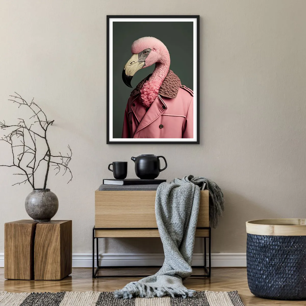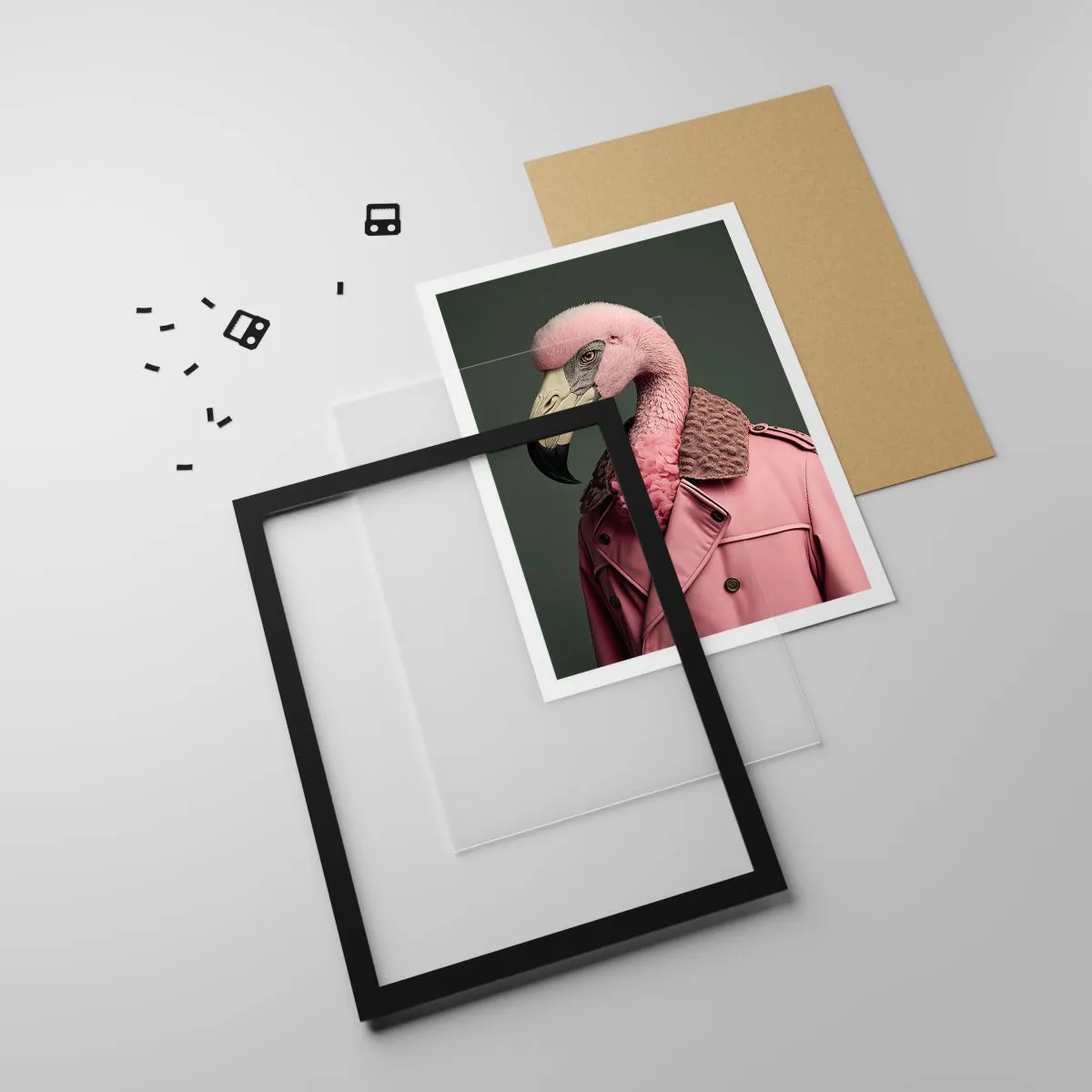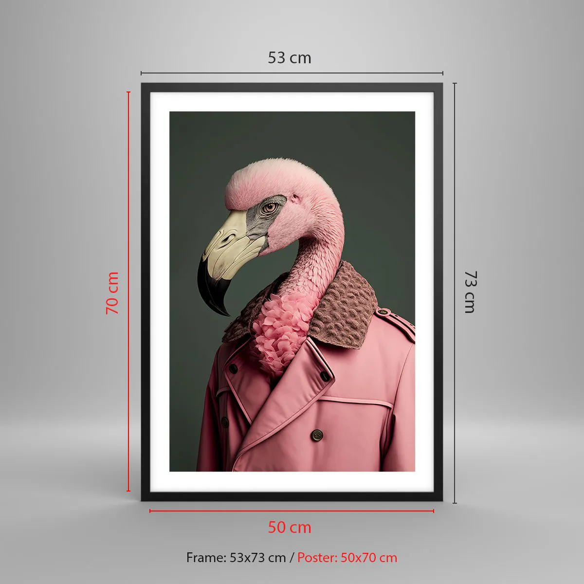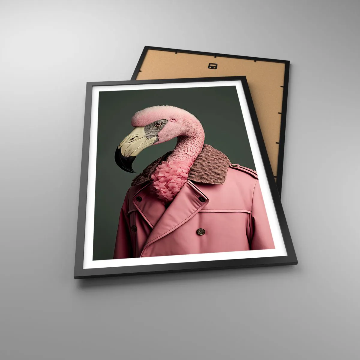 Pôster com moldura preta - Um flamingo estiloso com um casaco elegante - 50x70cm - Verdadeira elegância - Decoração de parede moderna para a sala de estar e quarto ARTTOR