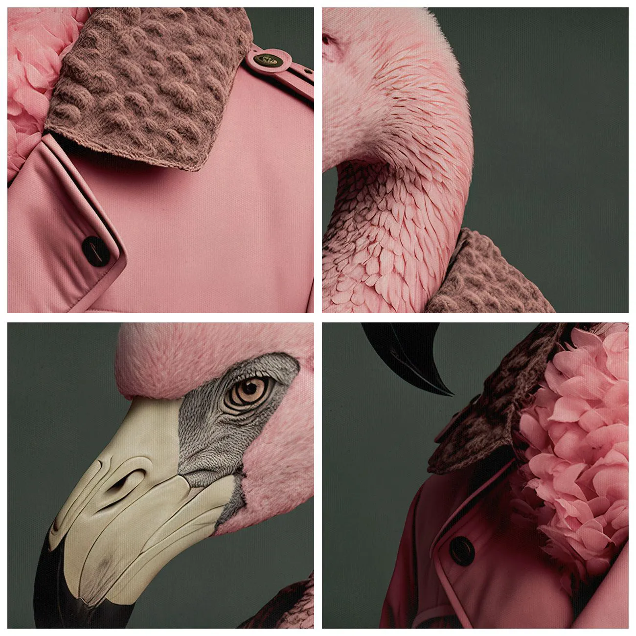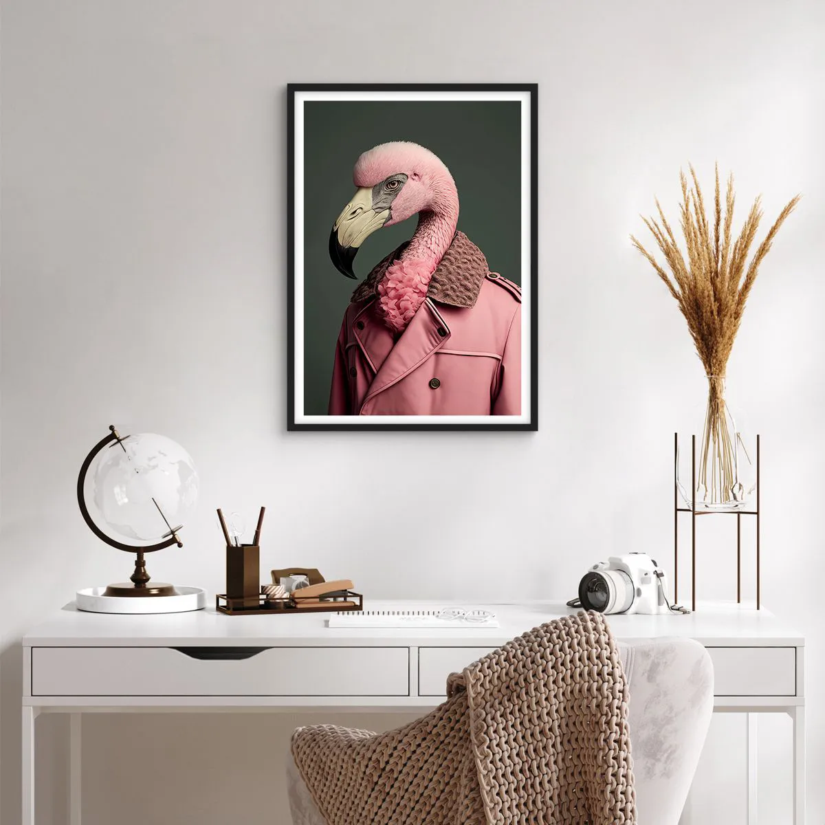 - O pôster retrata um flamingo com um elegante casaco rosa, conferindo-lhe um toque estiloso e levemente surreal. O contraste entre natureza e moda cria uma composição intrigante e única.