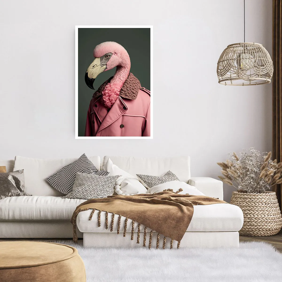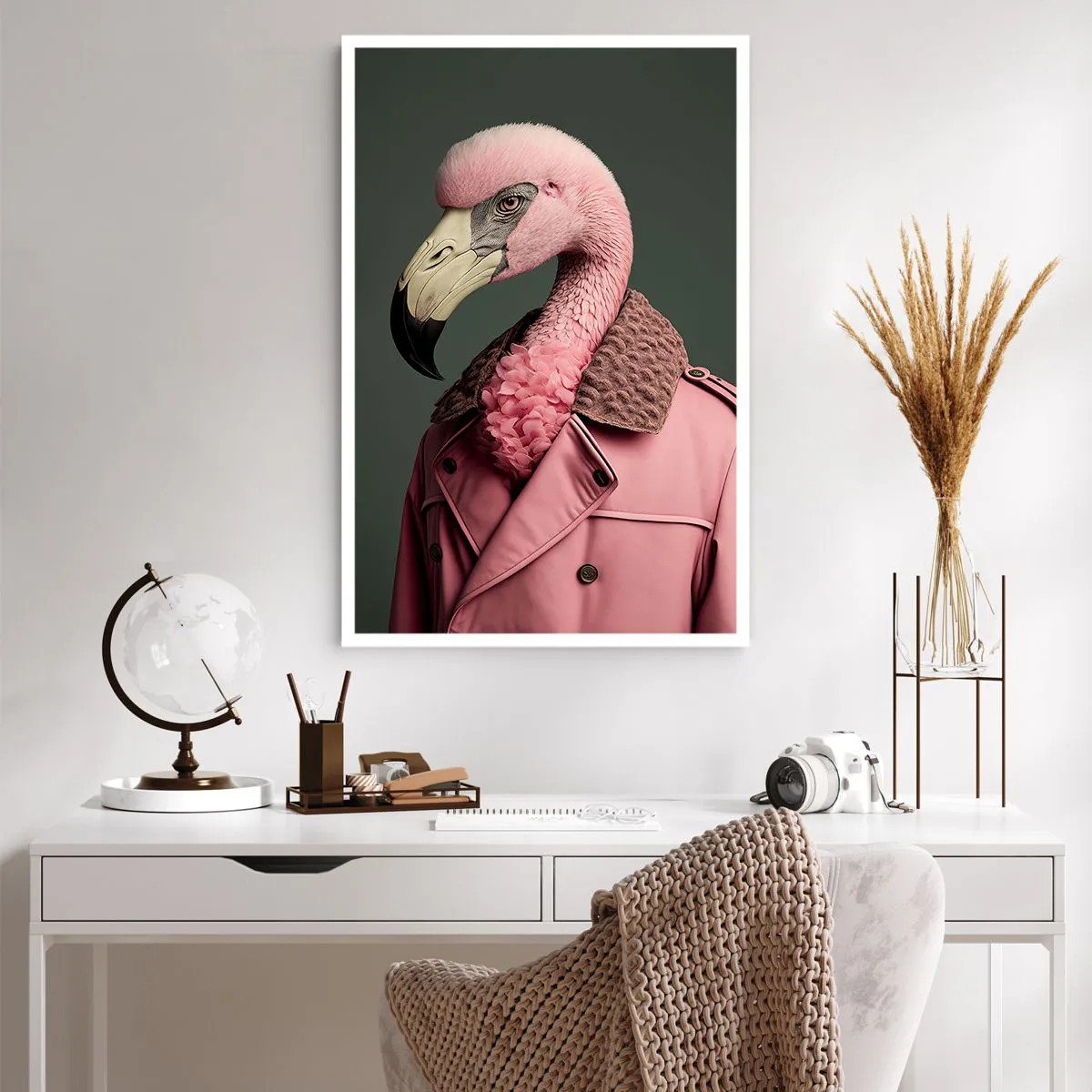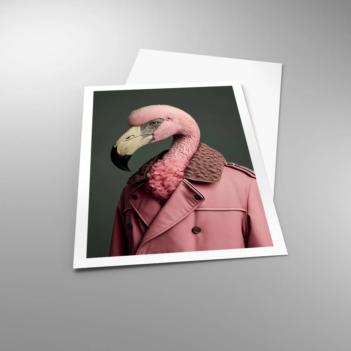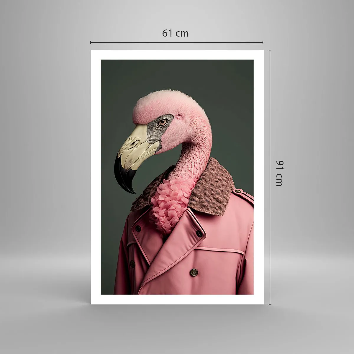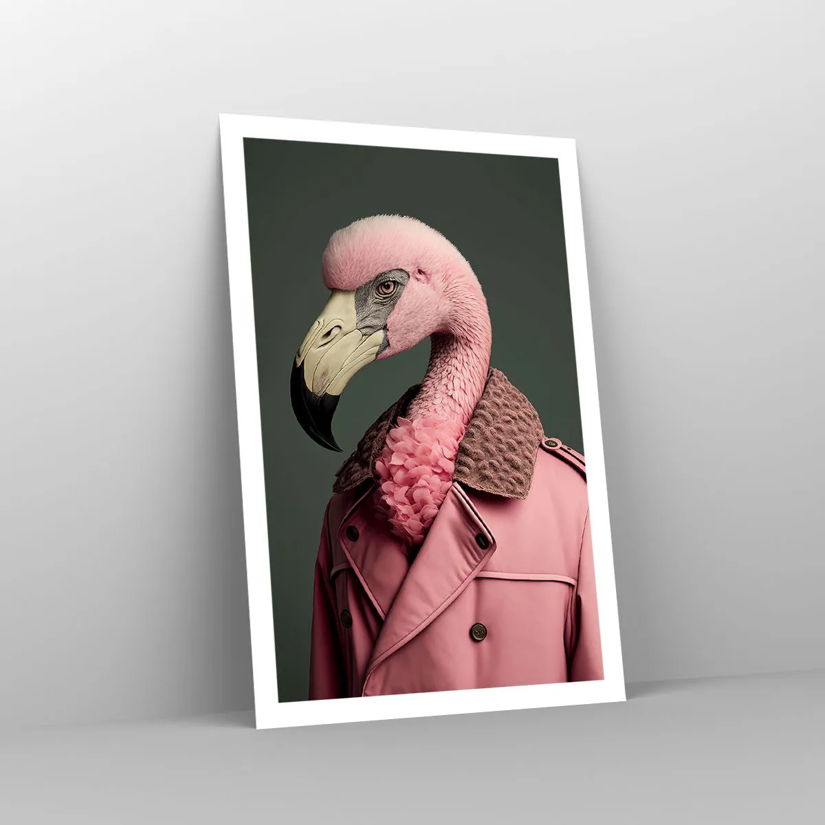 • Flamingo, Retrato, Vestido, Moda, Pastel, Animais, Para a sala de jantar, Para o hall, Para a sala de estar, Para o quarto, Rosa, cinza, Vertical
