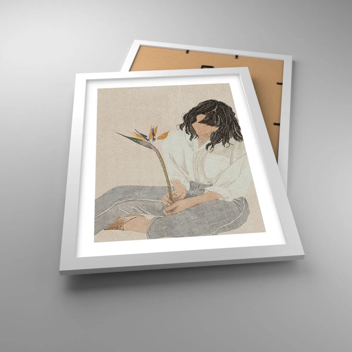 Pôster em moldura branca - Retrato com uma flor exótica - 30x40 cm