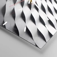 O relógio é feito de vidro de 4mm de espessura. A tecnologia de relógio está em conformidade com a classe de segurança 2B2 de acordo com a norma PN-EN 12600:2004, o que garante resistência ao impacto. O relógio em vidro está pronto para ser pendurado – possui um gancho de metal montado na parte de trás do relógio e um espaçador de espuma, que regula a distância uniforme entre o relógio e a parede. O relógio tem um mecanismo de fluxo silencioso alimentado por uma bateria de 1,5 V - bateria AA (a bateria não está incluída).