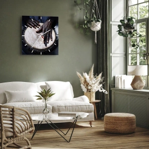 O relógio é feito de vidro de 4mm de espessura. A tecnologia de relógio está em conformidade com a classe de segurança 2B2 de acordo com a norma PN-EN 12600:2004, o que garante resistência ao impacto. O relógio em vidro está pronto para ser pendurado – possui um gancho de metal montado na parte de trás do relógio e um espaçador de espuma, que regula a distância uniforme entre o relógio e a parede. O relógio tem um mecanismo de fluxo silencioso alimentado por uma bateria de 1,5 V - bateria AA (a bateria não está incluída).