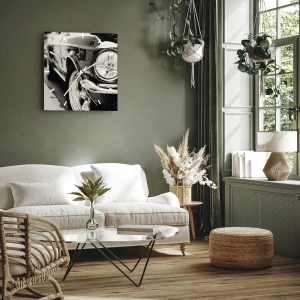 Os tons dominantes de preto e branco no gráfico são enriquecidos por flashes de cromo claramente marcados, que conferem à composição elegância e um caráter forte e mecânico. Um close-up do farol e um fragmento da carroceria permitem que você sinta a atmosfera de tempos passados e aprecie o artesanato de designers antigos. A pintura combina o estilo vintage com uma apresentação moderna.