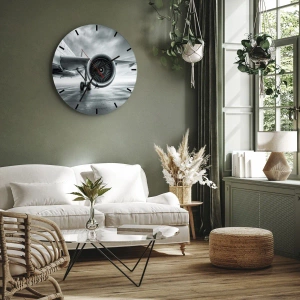 Relógio de parede funcionará muito bem como decoração em um escritório, escritório, sala de jovens ou espaço criativo. O motivo relacionado à aviação é chamativo e inspirador – simboliza velocidade, desenvolvimento e sonhos de viajar. Este produto ARTTOR é feito em vidro, com formato redondo de 30x30 cm. Graças à impressão de alta qualidade, foi possível capturar os detalhes da superfície metálica e a profundidade realista. O mecanismo silencioso torna o relógio prático também em locais de trabalho e de estudo. "There is power!" é mais do que apenas um relógio de parede – é uma decoração moderna com um toque tecnológico. Uma combinação de arte, engenharia e forma precisa que traz energia e personalidade ao interior.
