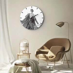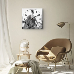O relógio é feito de vidro de 4mm de espessura. A tecnologia de relógio está em conformidade com a classe de segurança 2B2 de acordo com a norma PN-EN 12600:2004, o que garante resistência ao impacto. O relógio em vidro está pronto para ser pendurado – possui um gancho de metal montado na parte de trás do relógio e um espaçador de espuma, que regula a distância uniforme entre o relógio e a parede. O relógio tem um mecanismo de fluxo silencioso alimentado por uma bateria de 1,5 V - bateria AA (a bateria não está incluída).