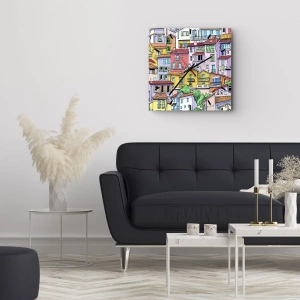 O relógio de parede "Cidade Feliz" combina funcionalidade com uma estética alegre e ilustrativa. No centro da composição, encontra-se um gráfico dinâmico representando cortiços coloridos, dispostos em cascata, típico das cidades mediterrâneas. O mostrador do relógio apresenta edifícios em cores intensas, como amarelo, vermelho, rosa, azul e verde. Tudo evoca memórias de férias e uma atmosfera descontraída. É a escolha perfeita para quem deseja infundir seu interior com energia positiva e uma atmosfera artística.