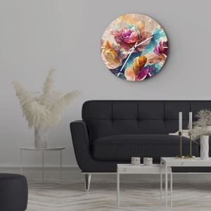 "Colorful Splendor of a Bouquet" não é apenas um relógio decorativo, mas também uma maneira de adicionar um toque distinto ao interior. Seu estilo colorido e motivo floral se encaixam nas últimas tendências de design de interiores, e a presença de um relógio sobre vidro lhe confere um visual moderno e uma estética do mais alto nível.