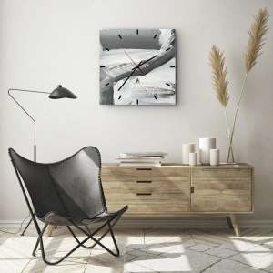 O relógio é feito de vidro de 4mm de espessura. A tecnologia de relógio está em conformidade com a classe de segurança 2B2 de acordo com a norma PN-EN 12600:2004, o que garante resistência ao impacto. O relógio em vidro está pronto para ser pendurado – possui um gancho de metal montado na parte de trás do relógio e um espaçador de espuma, que regula a distância uniforme entre o relógio e a parede. O relógio tem um mecanismo de fluxo silencioso alimentado por uma bateria de 1,5 V - bateria AA (a bateria não está incluída).