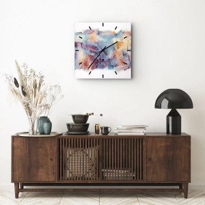 - Este relógio de parede redondo artístico de 30x30 cm sobre vidro apresenta uma composição de pinceladas dinâmicas e coloridas. Um toque decorativo vibrante para interiores modernos.