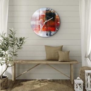 - Este relógio de parede de vidro de 30x30 cm apresenta um design abstrato intenso em tons de vermelho e preto. Uma composição geométrica com um efeito artístico marcante, perfeita para interiores modernos.