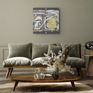 O esquema de cores da composição inclui tons de marrom, bege, verde e amarelo, e o conjunto dá a impressão de uma superfície pintada à mão com uma estrutura complexa. As formas evocam símbolos rituais antigos ou representações simbólicas de espaço e energia.
