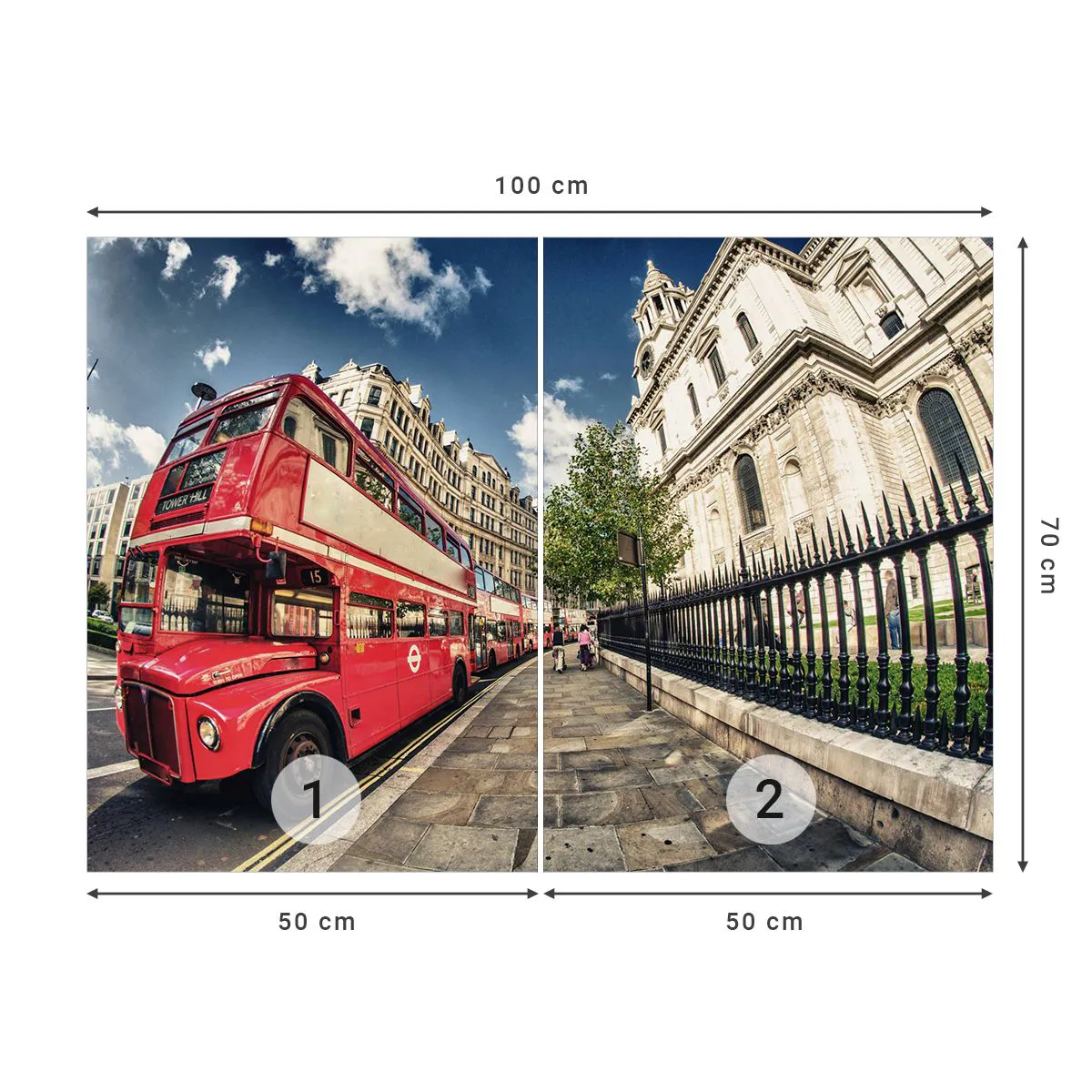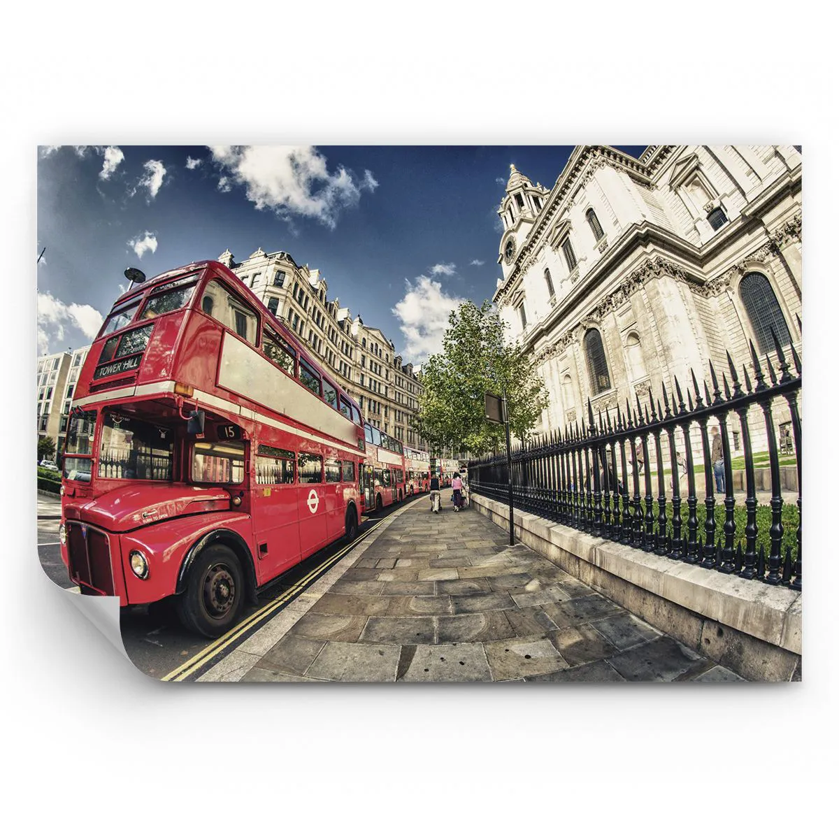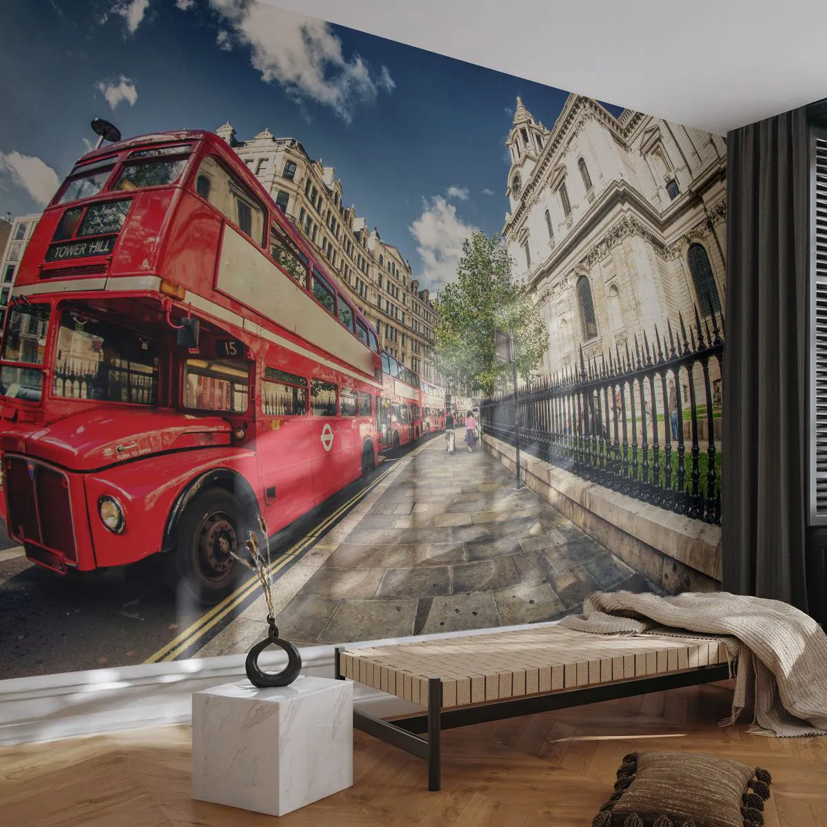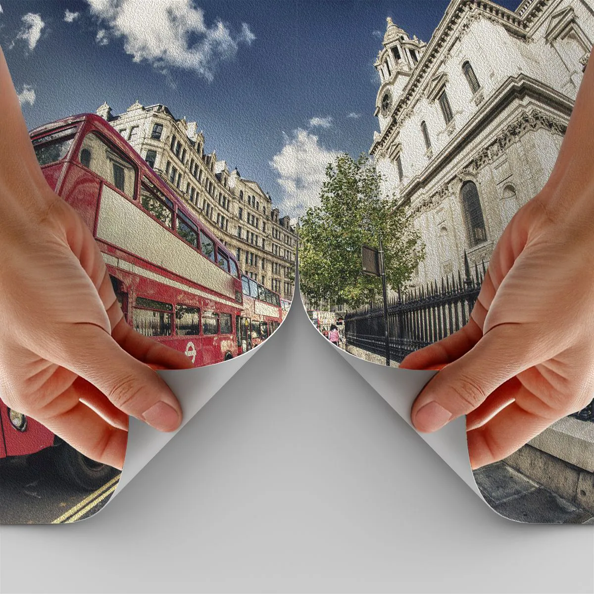Papel de Parede Premium Sand - Rua de Londres em cinza e vermelho - Cidade, Londres, ônibus vermelho - 100x70 cm