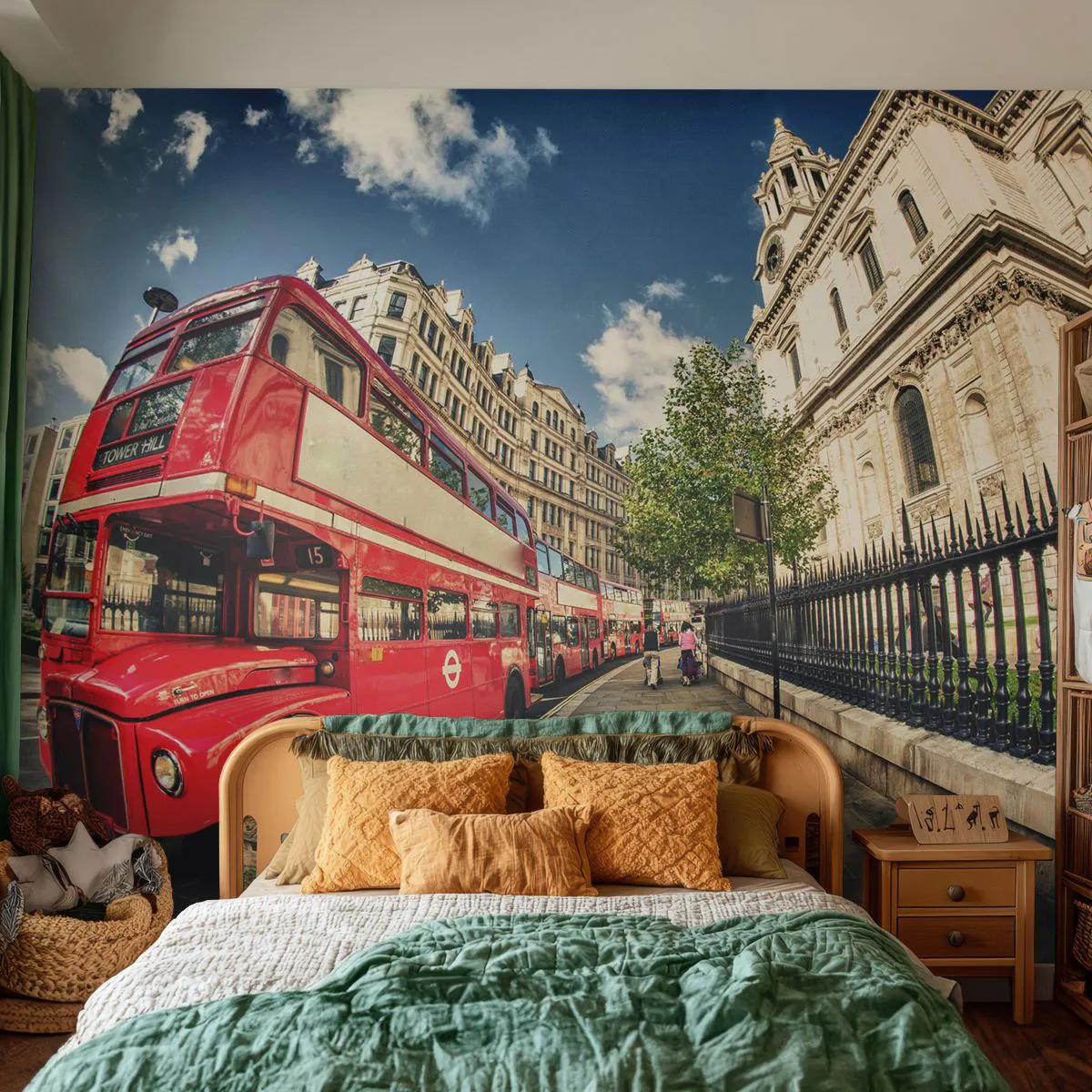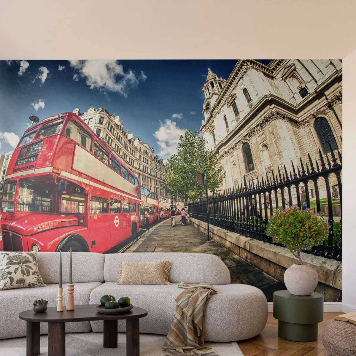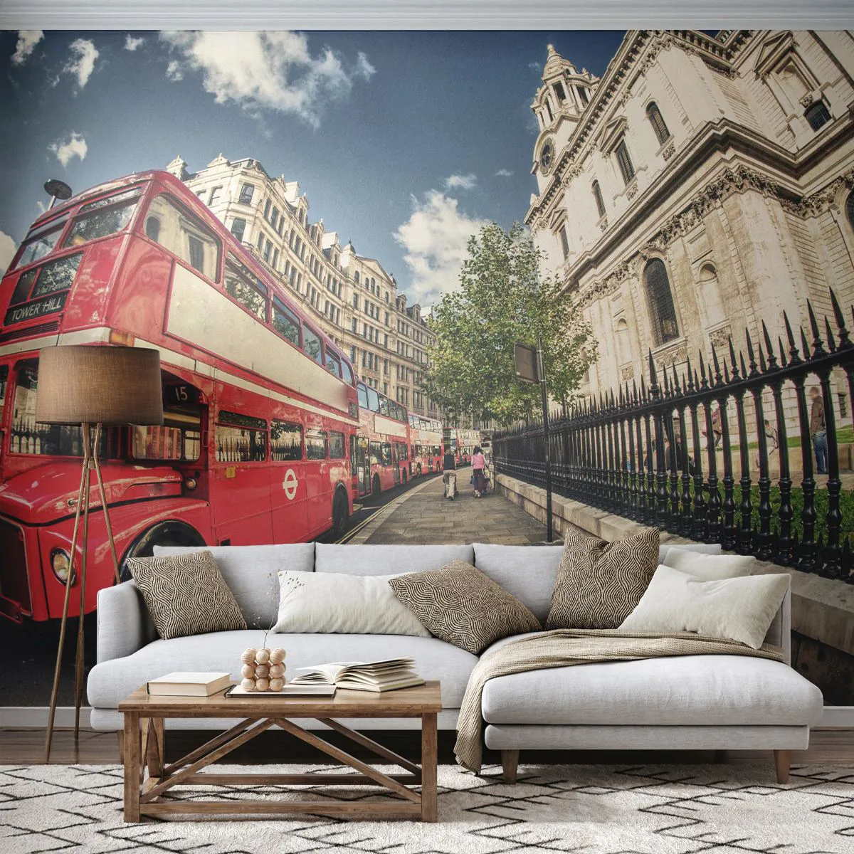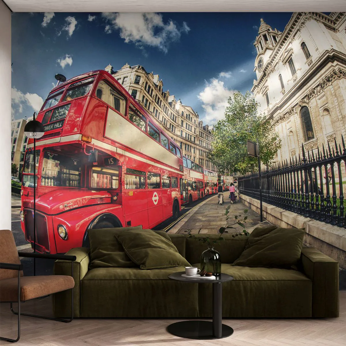 Papel de Parede Premium Sand - Rua de Londres em cinza e vermelho - Cidade, Londres, ônibus vermelho - 100x70 cm