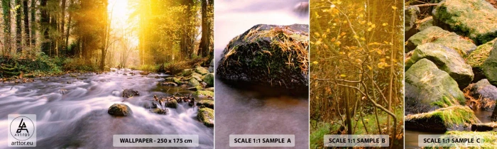 Amostra de Papel de Parede Standard Eco - Malaquita em um cenário de ouro e prata - Paisagem, Córrego da montanha, Floresta - 100x30 cm