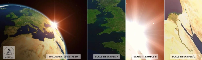Amostra de Papel de Parede Standard Eco - Nascer do Sol - Cosmos, Globo, Continentes - 100x30 cm